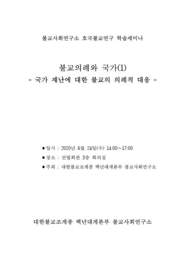 - [불교사회연구소] 호국불교연구 상반기 세미나 자료집2020.06.24.pdf (1.0M) 127회 다운로드 | DATE : 2021-01-04 16:27:17