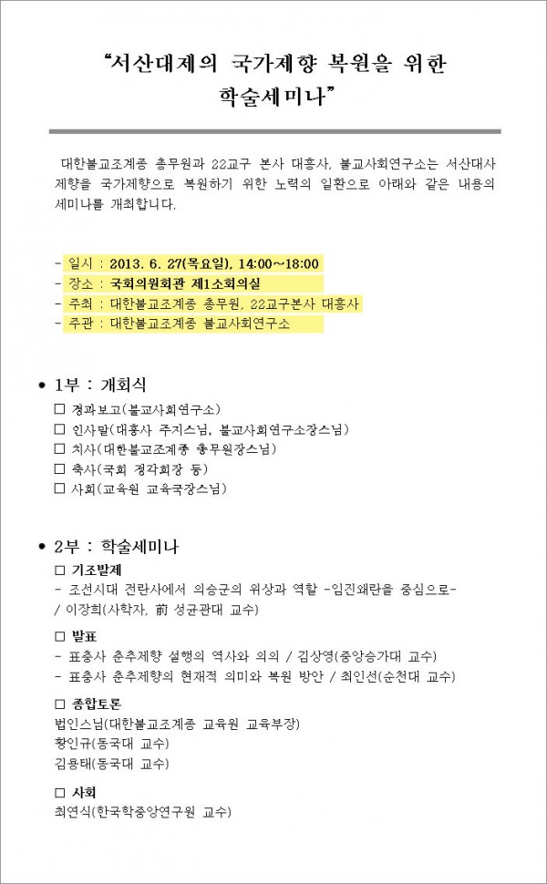 서산대제 학술세미나(6/27) 개최 안내 페이지 정보 작성자 관리자 댓글 0건 조회 1,702회 작성일 18-12-27 11:14 본문 서산대제 학술세미나(6/27) 개최 안내 목록 이전글불교사회연구소 기획연구위원회 회의(6/12) 개최 결과 18.12.27 다음글'역사교과서의 불교 서술체재와 내용' 세미나(6/15) 개최 안내 18.12.27 댓글목록 댓글목록 등록된 댓글이 없습니다.