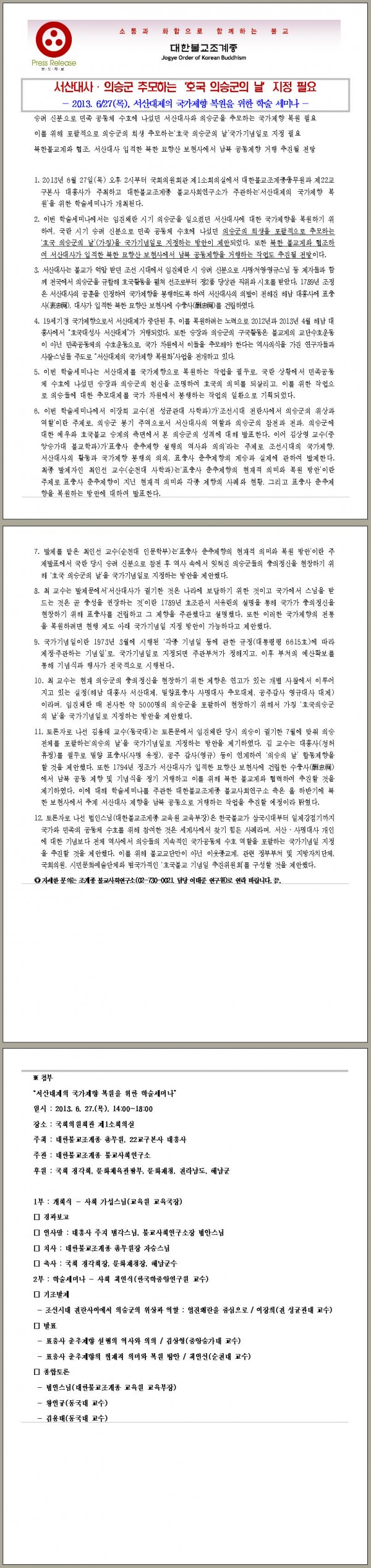 [보도자료]서산대제의 국가제향 복원을 위한 학술 세미나 페이지 정보 작성자 관리자 댓글 0건 조회 1,747회 작성일 18-12-27 11:43 본문 ※ 이미지를 클릭해서 보시면 더 잘보입니다. 목록 이전글서산대제의 국가제향 복원을 위한 학술세미나(6.27) 개최 결과 18.12.27 다음글'역사교과서의 불교 서술체재와 내용' 세미나(6/15) 개최 결과 18.12.27 댓글목록 댓글목록 등록된 댓글이 없습니다.