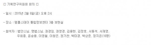 불교사회연구소 기획연구위원회 회의 개최결과 페이지 정보 작성자 관리자 댓글 0건 조회 2,441회 작성일 18-12-28 14:32 본문 목록 이전글불교사회 교재편찬위원회 제 5차 회의 결과 18.12.28 다음글호국불교연구 논문집 및 자료집 발간 기자간담회 18.12.28 댓글목록 댓글목록 등록된 댓글이 없습니다.