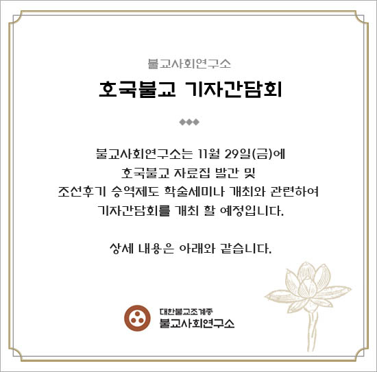 [보도자료]호국불교 자료집 발간 및 세미나개최 기자간담회(11/29) 페이지 정보 작성자 관리자 댓글 0건 조회 2,752회 작성일 18-12-27 16:39 본문 [보도자료]호국불교 자료집 발간 및 세미나개최 기자간담회(11/29) 목록 이전글[보도자료]호국불교 하반기 학술세미나 개최(12/5) 18.12.27 다음글3대 빈곤('3poor') 보고서 발간예정 18.12.27 댓글목록 댓글목록 등록된 댓글이 없습니다.